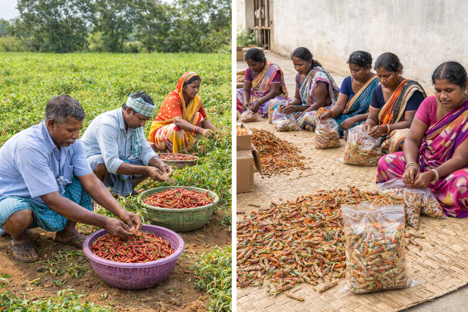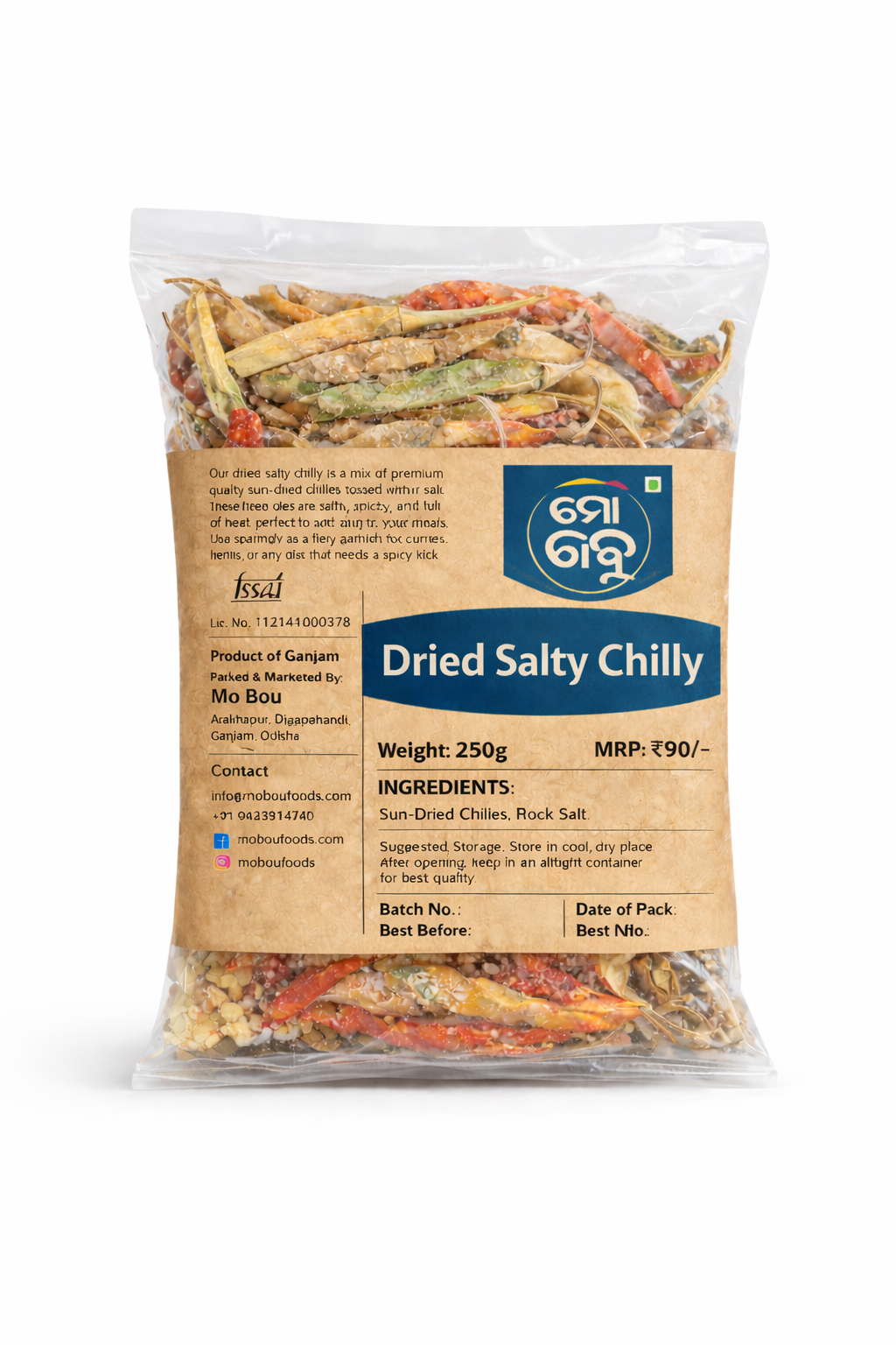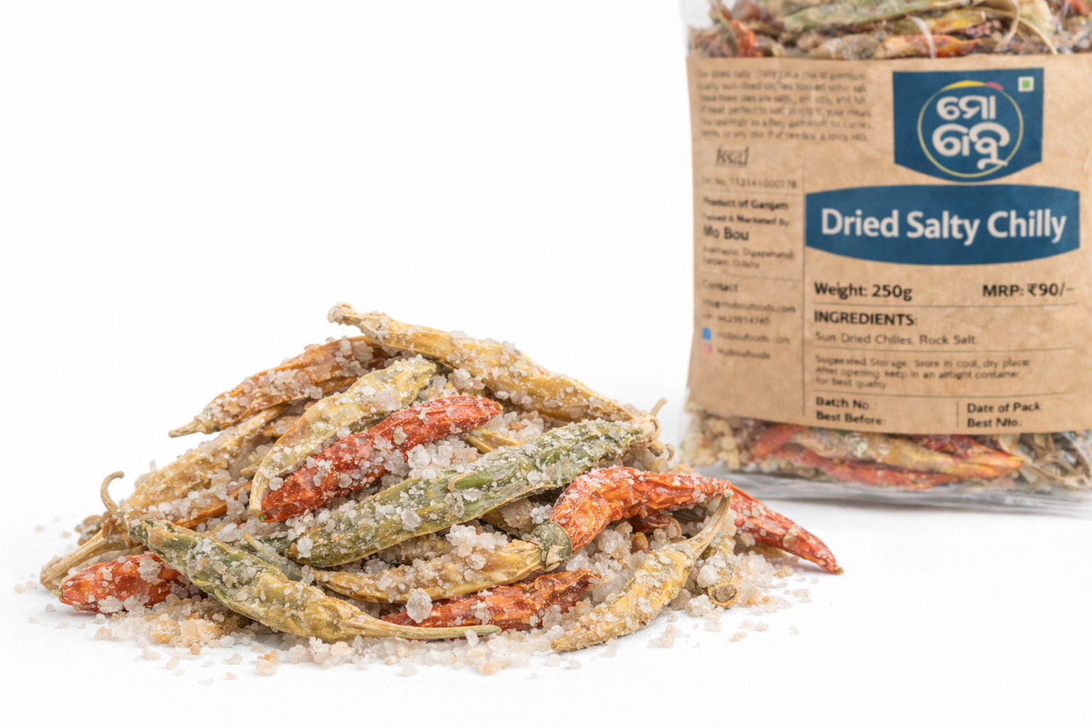 ઓડિશાના ગંજમથી મેળવેલ અને મો બોઉ દ્વારા પેક કરાયેલ, આ ઉત્પાદન પેઢી દર પેઢી ચાલતી પરંપરાગત પદ્ધતિઓનો ઉપયોગ કરીને તૈયાર કરવામાં આવે છે. મરચાંને કાળજીપૂર્વક પસંદ કરવામાં આવે છે, ધોવામાં આવે છે અને તેમના કુદરતી ગુણધર્મોને જાળવી રાખવા માટે તડકામાં સૂકવવામાં આવે છે.