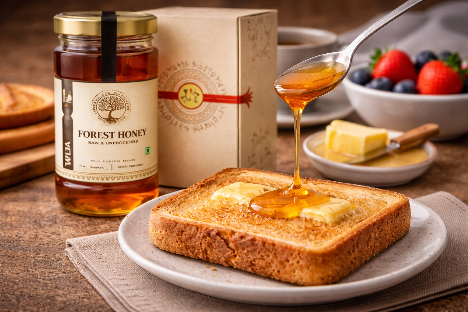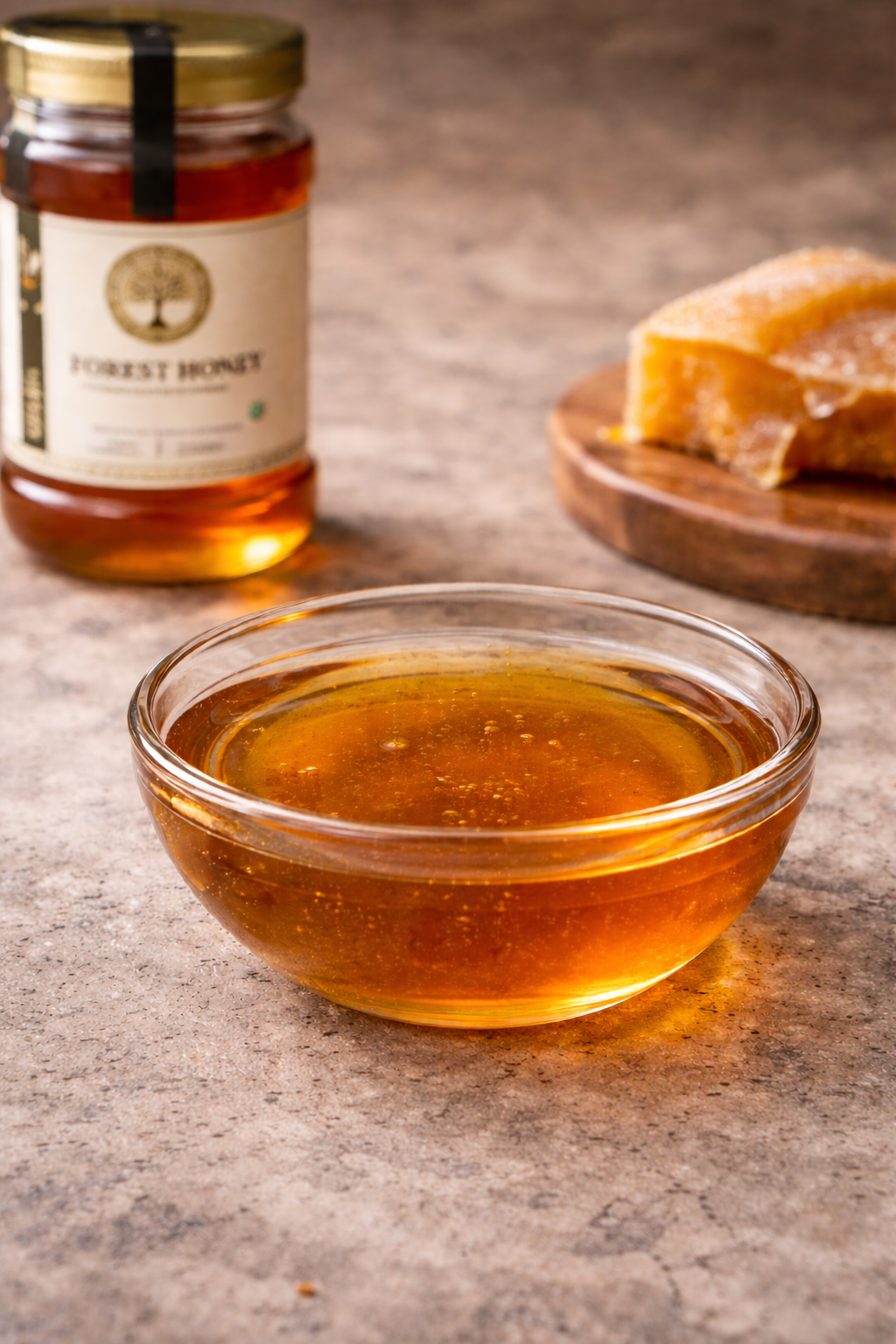 This is natural forest honey collected from wild bee hives and minimally processed. It contains no additives, preservatives, colours, or flavouring agents.