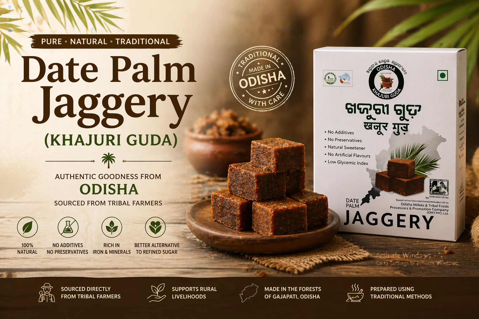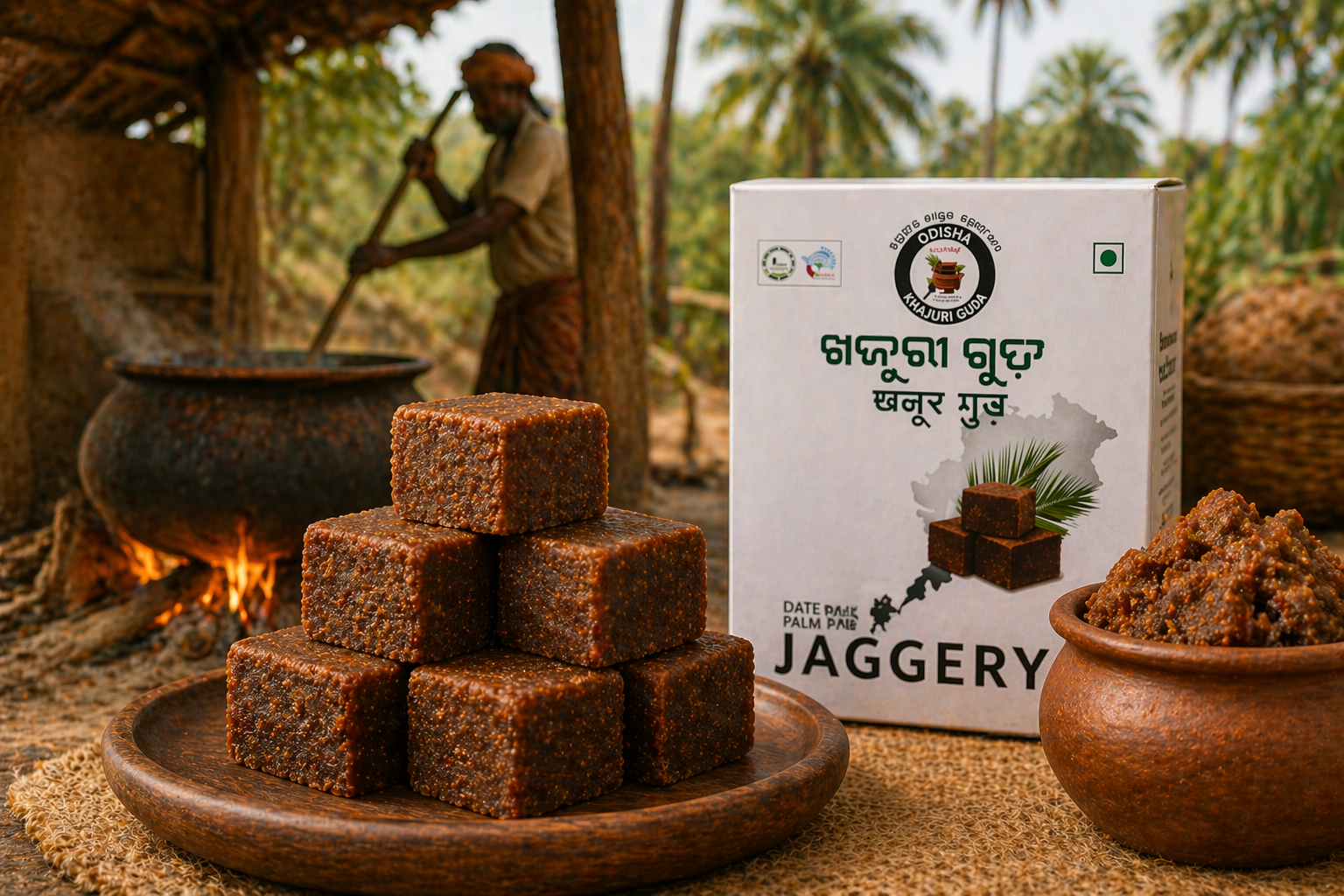 Date Palm Jaggery is a traditional sweetener made from the sap of date palm trees. In Odisha, it is called Khajuri Guda and is harvested during the winter months when the sap is naturally rich and sweet.