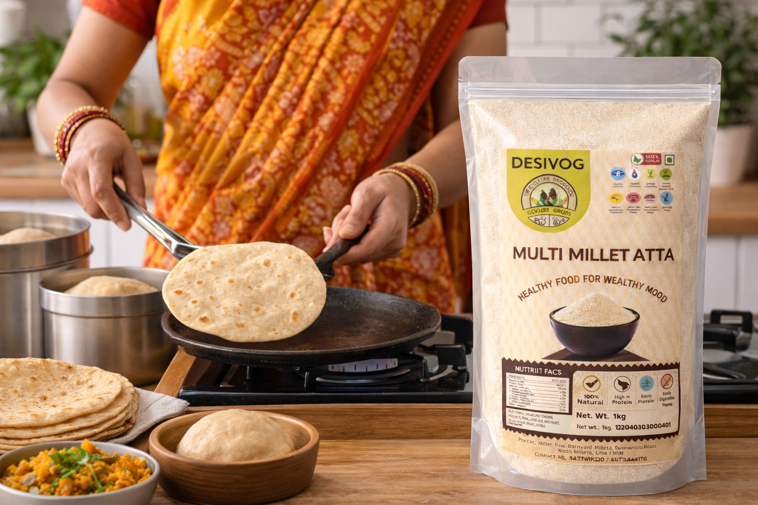 This millet atta is produced in Khordha, Odisha, by DesiVog, a woman-led enterprise focused on small-batch processing and local sourcing.