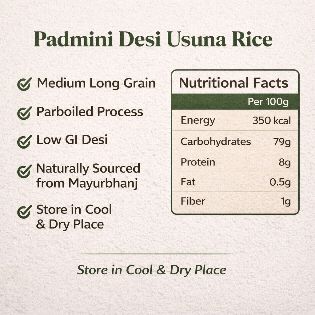 Padmini Desi Usuna Rice is a parboiled medium long grain rice sourced from Keonjhar district of Odisha. It is produced by Sitadevi Producer Group using traditional processing methods.